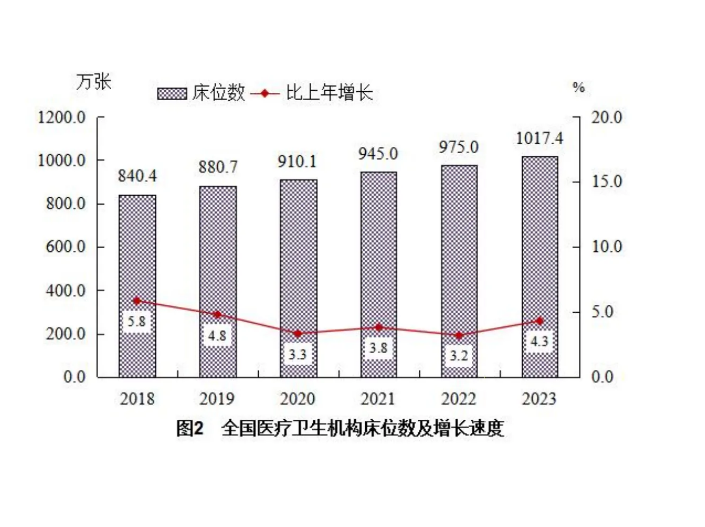 2023 年末,全國醫(yī)療衛(wèi)生機(jī)構(gòu)床位 1017.4萬張,其中:醫(yī)院 800.5 萬張(占 78.7%),基層醫(yī)療衛(wèi)生機(jī)構(gòu) 182.0 萬張(占 17.9%),專業(yè)公共衛(wèi)生機(jī)構(gòu) 32.5 萬張(占 3.2%)。