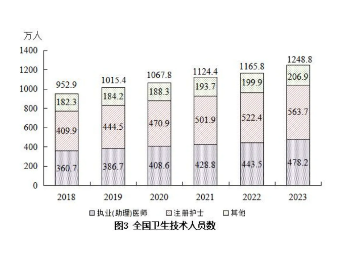 2023 年末,全國衛(wèi)生人員總數(shù)1523.7 萬人,比上年增加 82.7 萬人(增長 5.7%)。