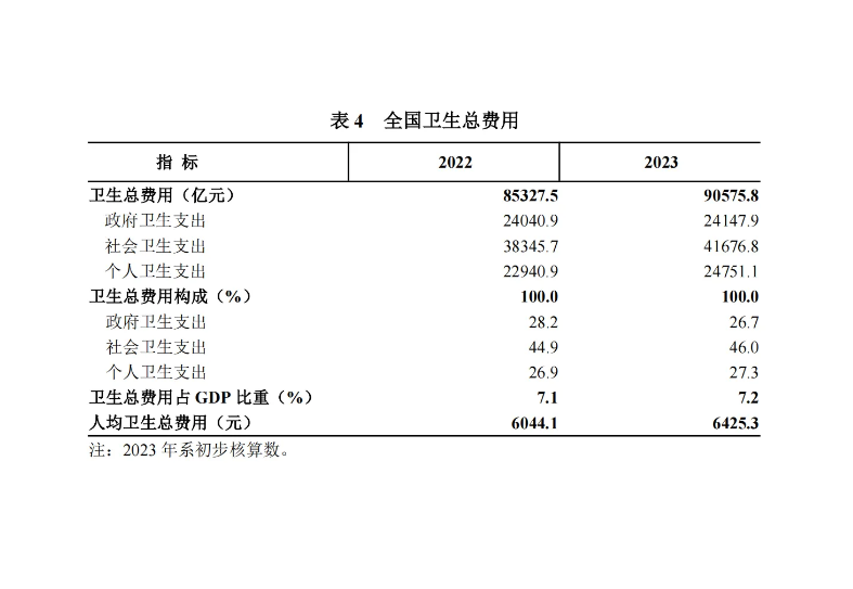 2023 年全國衛(wèi)生總費(fèi)用初步核算為90575.8 億元,其中:政府衛(wèi)生支出 24147.9 億元,占 26.7%;社會衛(wèi)生支出 41676.8 億元,占 46.0%;個人衛(wèi)生支出 24751.1億元,占 27.3%。人均衛(wèi)生總費(fèi)用 6425.3 元,衛(wèi)生總費(fèi)用占GDP 的比重為 7.2%。