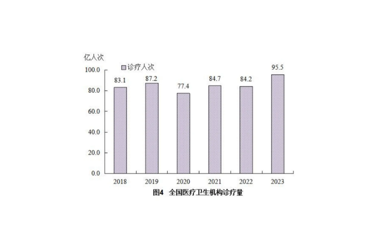 2023 年,全國醫(yī)療衛(wèi)生機(jī)構(gòu)總診療人次 95.5 億,比上年增加 11.3 億人次(增長 13.5%)。2023年居民平均到醫(yī)療衛(wèi)生機(jī)構(gòu)就診 6.8 次。