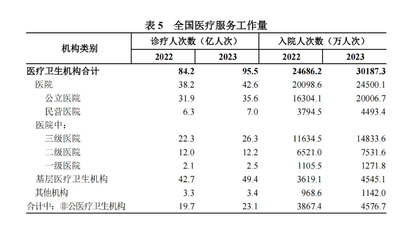 2023 年總診療量中,醫(yī)院 42.6 億人次(占 44.6%),基層醫(yī)療衛(wèi)生機(jī)構(gòu) 49.4 億人次(占 51.8%),其他醫(yī)療衛(wèi)生機(jī)構(gòu) 3.4 億人次(占 3.6%)。