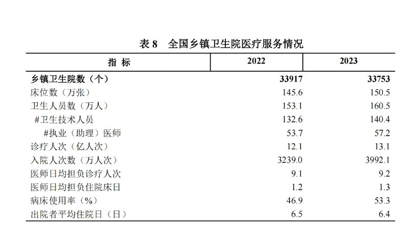 2023 年末,全國共有 3.4 萬個鄉(xiāng)鎮(zhèn)衛(wèi)生院,床位 150.5萬張,衛(wèi)生人員 160.5 萬人(其中衛(wèi)生技術(shù)人員 140.4 萬人)。