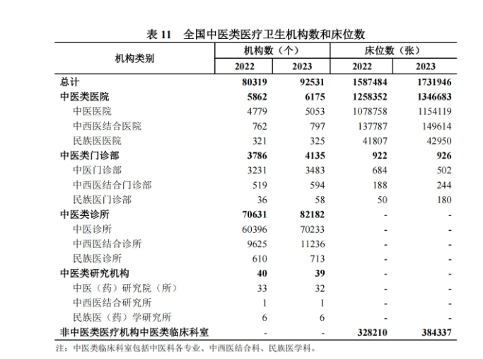 其中:中醫(yī)類醫(yī)院 6175 個,中醫(yī)類門診部、診所 86317 個,中醫(yī)類研究機(jī)構(gòu) 39 個。與上年比較,中醫(yī)類醫(yī)院增加 313個,中醫(yī)類門診部及診所增加 11900 個,2023 年,全國中醫(yī)類醫(yī)療衛(wèi)生機(jī)構(gòu)床位 173.2 萬張,其中:中醫(yī)類醫(yī)院 134.7 萬張(占 77.8%)。