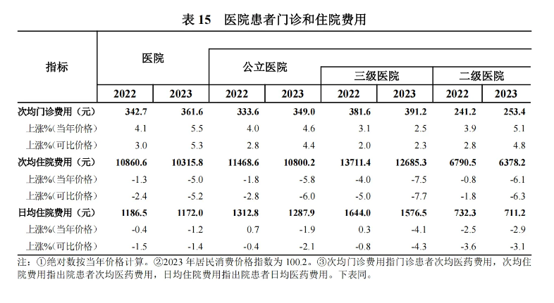 2023 年,各級公立醫(yī)院中,三級醫(yī)院次均門診費(fèi)用按當(dāng)年價格比上年上漲 2.5%,按可比價格上漲 2.3%;次均住院費(fèi)用按當(dāng)年價格比上年下降 7.5%,按可比價格下降 7.7%(見表 15)。