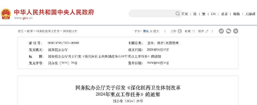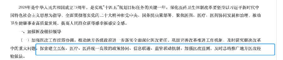 2024年6月初,國務(wù)院辦公廳發(fā)布《深化醫(yī)藥衛(wèi)生體制改革2024年重點工作任務(wù)》,就推動地方各級政府進(jìn)一步落實全面深化醫(yī)改責(zé)任,探索建立醫(yī)保、醫(yī)療、醫(yī)藥統(tǒng)一高效的政策協(xié)同、信息聯(lián)通、監(jiān)管聯(lián)動機(jī)制,做了全面要求。