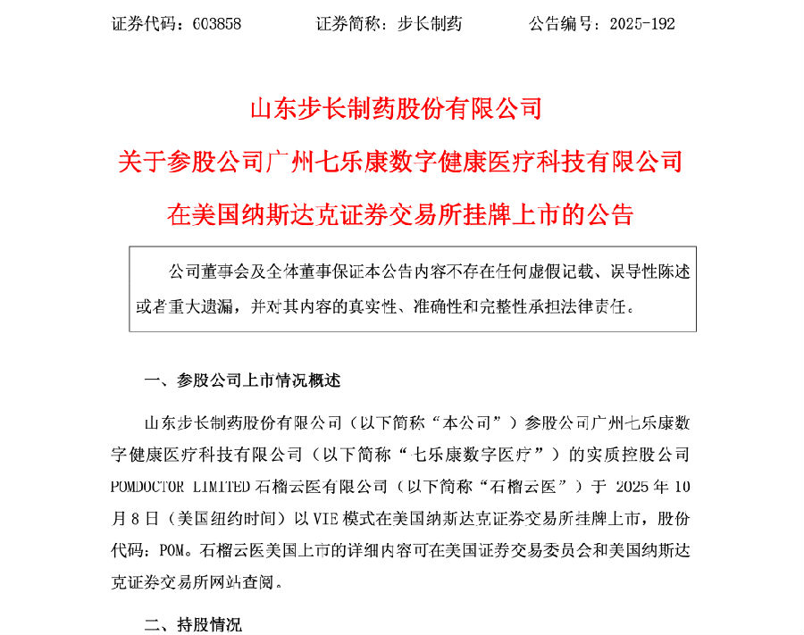 10月14日,山東步長(zhǎng)制藥發(fā)布公告同步這一喜訊,步長(zhǎng)參股公司七樂(lè)康數(shù)字醫(yī)療實(shí)質(zhì)控股公司石榴云醫(yī)10月8日(紐約時(shí)間)以VIE模式在美國(guó)納斯達(dá)克證券交易所掛牌上市。以上市首日表現(xiàn)計(jì)算,其市值約為4.74億美元。